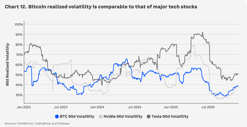 While Bitcoin is currently consolidating around the $90,000-$94,000 range (down from its October 2025 peak of $126k, post October 10th’s massive deleveraging episode), it’s clear that BTC’s volatility is no longer an outlier among other assets; it’s on par with major high-growth tech stocks at the end of 2025.