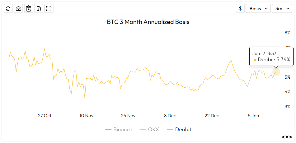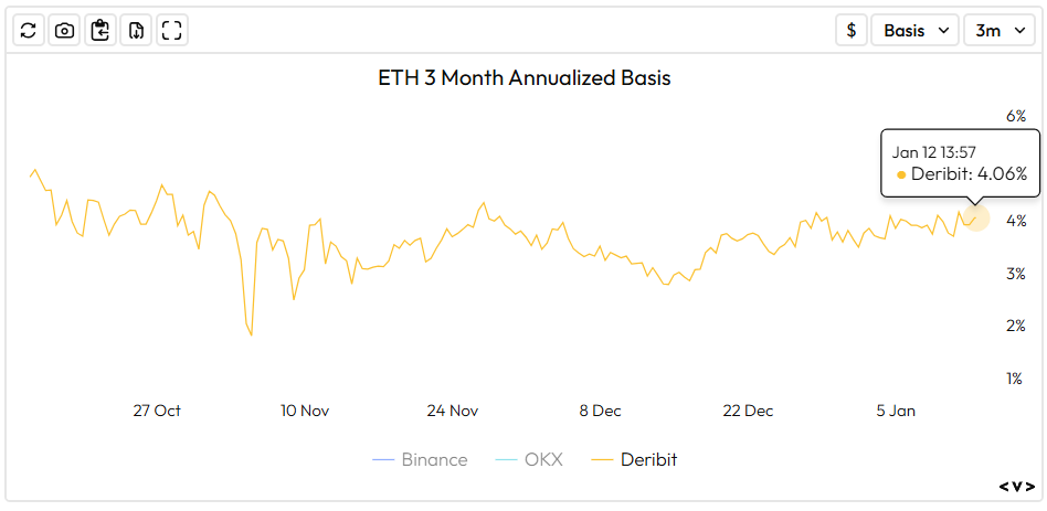 The BTC 90-day basis rate currently stands at 5.34%, offering an attractive premium relative to the risk-free rate. Meanwhile, the ETH basis rate has moved up to 4.06%, reflecting a similar upward bias in yield expectations.