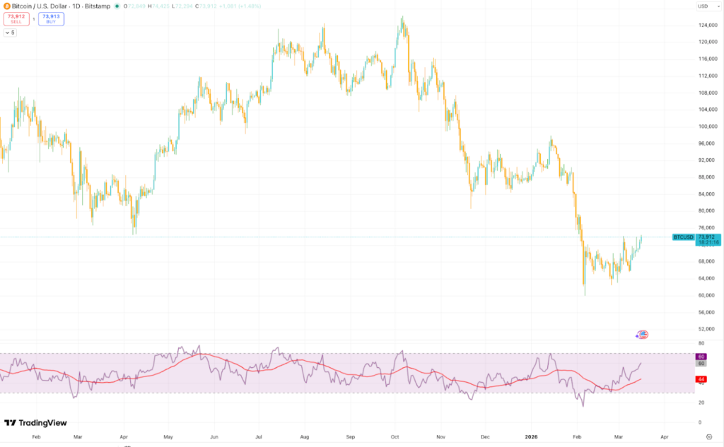 BTC remains range-bound between US$63k and US$73k and sits roughly 19% below its January opening levels. Importantly, the correlation with equities has weakened noticeably since the war began. BTC is outperforming both tech and gold on a two-week basis, which may indicate an evolving role as a macro-diversifier rather than a pure risk-on instrument.