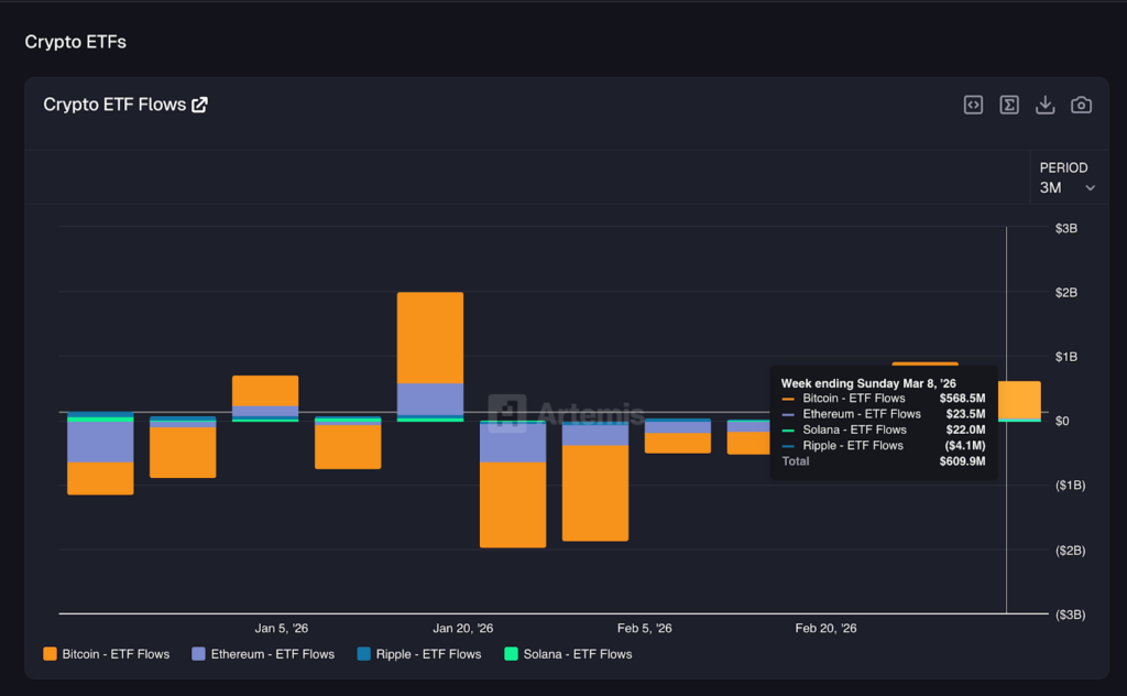 Crypto delivered its strongest week since September 2025, with BTC rallying approximately 9% from Monday’s lows and reclaiming ~US$71,300. ETH followed, gaining about 6% and holding above the US$2000 level. The rally was supported by a notable return of ETF flows – US spot Bitcoin ETFs logged their first five-day inflow streak of 2026, pulling in approximately US$767m for the week, with the strongest day on Monday at ~$251m led by BlockRock’s IBIT. Similarly, spot Ethereum ETFs added roughly US$212m across four consecutive days of inflows.