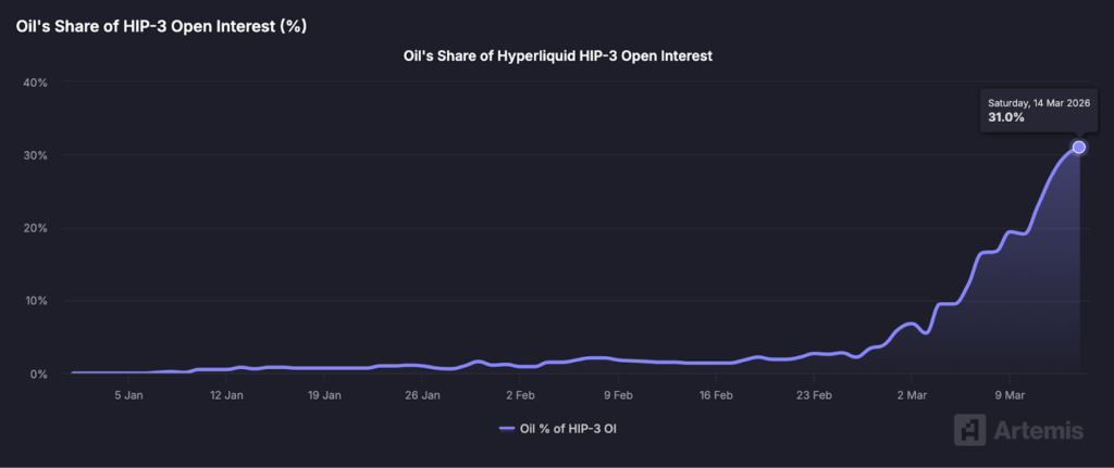 Beyond the majors, the on-chain and structural picture continued to develop. Hyperliquid’s HIP-3 markets hit a fresh record in open interest at roughly $1.3 billion, with oil’s share of total OI surging to 31% by March 14 from negligible levels in January. Tokenized gold supply also broke higher, reaching approximately 1.2 million ounces on-chain (~$6.1B), benefiting from both the traditional safe-haven bid and growing institutional comfort with on-chain wrappers as a distribution rail.