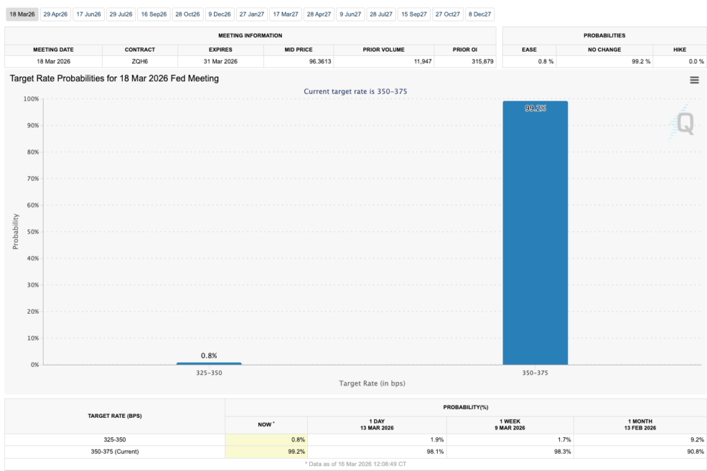 The Fed meets on March 17-18, with the decision due Wednesday US time. A hold at 3.50-3.75% is near certain (99% market pricing). The real event risk is in the updated dot plot and Summary of Economic Projections. With core PCE at 3.1%, oil above $100, and payrolls now negative, the FOMC is stuck between a weakening labour market and re-accelerating inflation expectations. Markets currently price only a single 25bp cut for 2026, likely not before June at the earliest. This is a significant reprice from the roughly 50bp of cuts that were expected as recently as February. Powell’s final press conference before his term expires on May 23 will be closely watched for any signal on how the Fed intends to navigate the oil shock.