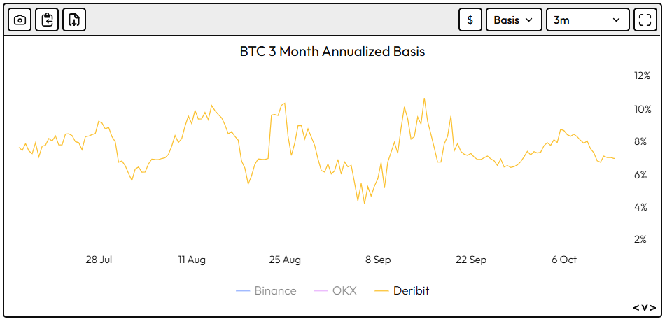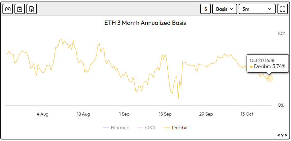 BTC and ETH basis rates are down slightly over the week again. BTC’s 90 day basis rate is sitting at 6.73% and ETH’s is at 3.74%.
