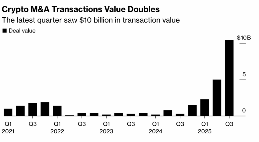 Record M&A activity reinforced where value is accruing – market structure, distribution, derivatives, and payments rails, rather than speculative infrastructure.