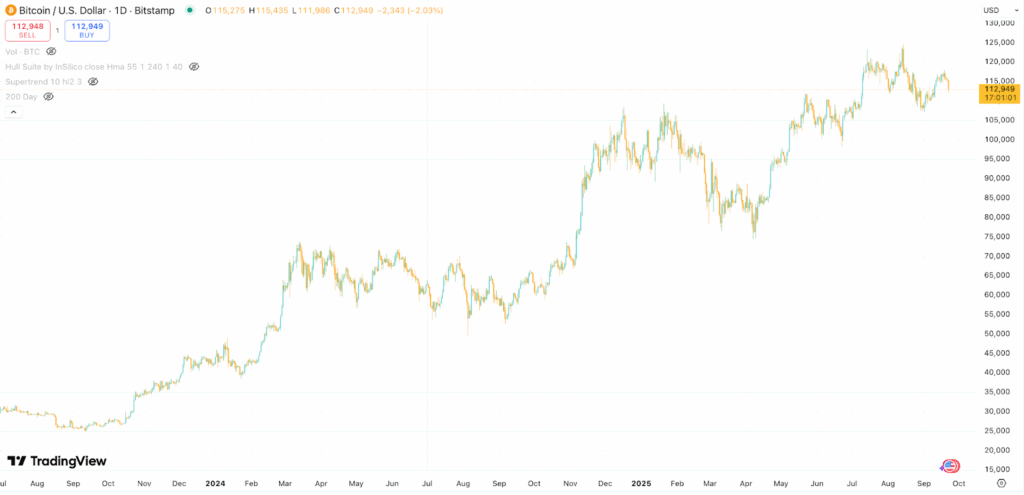 The mood shifted during Powell’s press conference. He dismissed the possibility of a 50bps “jumbo” cut outright, reiterated concerns that inflation remains elevated, and admitted uncertainty around the broader outlook – noting “no one knows where the economy will be in three years.” The market viewed this as hawkish, especially with positioning already skewed heavily toward a deeper easing path. Risk assets gave back gains into the close, leaving gold and Bitcoin still in strong trends but short-term momentum dented.