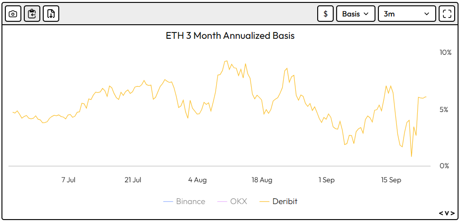 BTC’s basis rate has come off heavily over the week – down over 300bps to 7.06% annualised. ETH’s basis rate is also down over the week (6.08% p.a.).