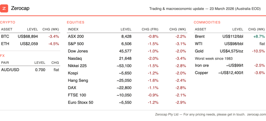 Equities had their worst week since the onset of the Iran conflict. The S&P 500 broke below its 200-day moving average for the first time since May 2025, which ended the 214-session streak above the trend line. The Nasdaq shed 2% alone to USD$21,648, with the Dow losing nearly 1% to USD$45,577.