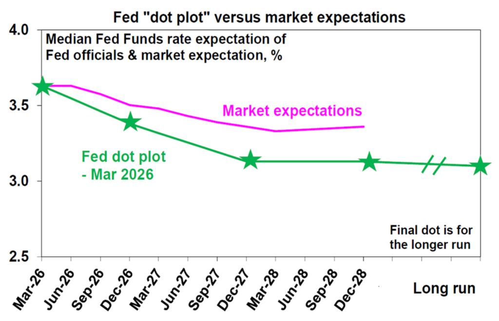 Last week, the Federal Reserve held rates on hold at 3.50%-3.75% as it remains firmly in wait-and-see mode, acknowledging the uncertain implications of the Iran conflict for both inflation and growth without committing to a direction. The dot plot still projects one more cut this year and another in 2027, but the distribution shifted meaningfully hawkish. 14 of 19 participants now see either no cut or just one in 2026, with four to five members downgrading from two cuts to one since December.