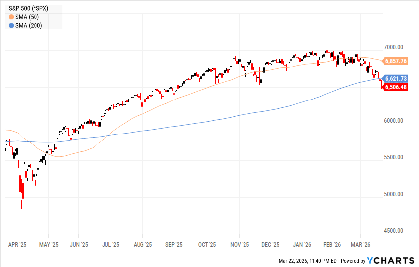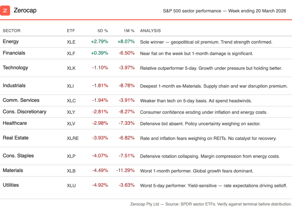 Selling accelerated sharply on Friday after Iraq declared force majeure on all foreign-operated oilfields and drones struck two Kuwaiti refineries, broadening the supply disruption beyond the Strait of Hormuz. Energy names continued to benefit while rate-sensitive sectors were crushed, with utilities down 4.1%, real estate off 3.1% and tech losing 2.2% on the week.