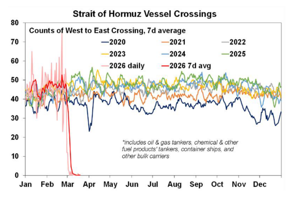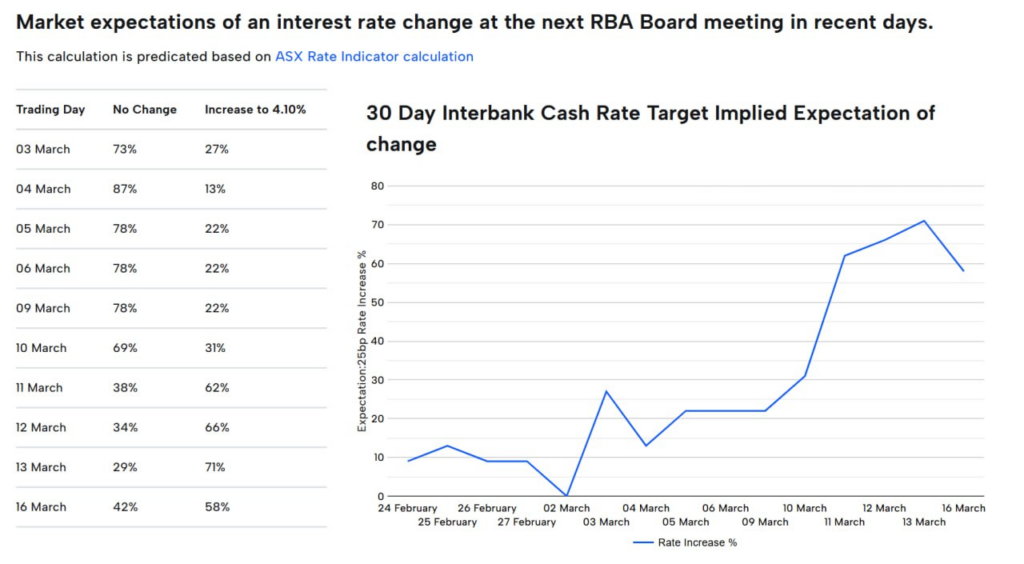 Locally in Australia, there were some interesting movements in the implied probabilities in market expectations of an interest rate change leading up to the RBA’s interest rate decision on the 17th, directly related to the war and the outlook for Oil. Early in the month, the market was pricing in a modest 27% chance of a 25 basis point increase in the cash rate. As the conflict in the Middle East developed, there were some concerning shifts in probabilities as the market began to lean towards an increase.