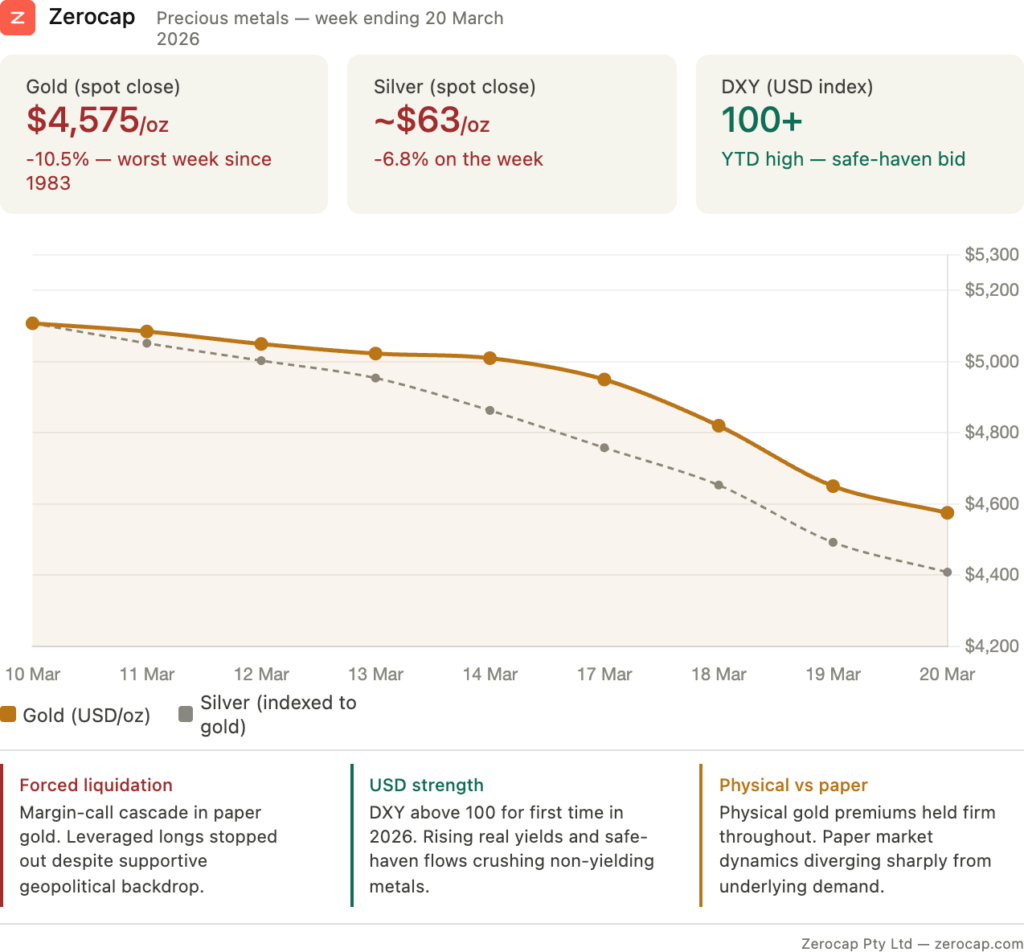 On the other hand, Gold suffered its worst weekly selloff since 1983, collapsing 10.5% to around USD$4,575/oz. This move was driven by USD strength, with the DXY pushing to its highest level of the year above 100, surging real yields and forced liquidation in paper markets (margin-call cascade where leveraged gold longs were stopped out despite the geopolitical environment being fundamentally supportive of the metal). Similarly, Silver fell around 6.8%.