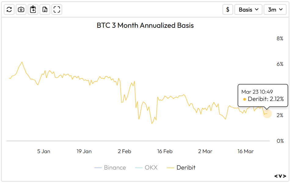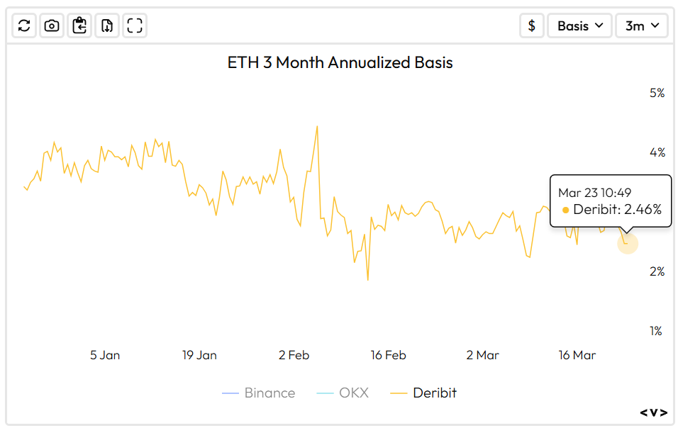 We are observing a rare decoupling in the basis markets: ETH is now yielding a higher basis rate than BTC, a reversal of historical norms. Despite the inherent ‘staking yield’ hurdle that typically discounts ETH futures, ETH’s 90-day annualized rate expanded by 22 bps this week to 2.46%, while BTC continues to trend toward multi-year lows at 2.15%.