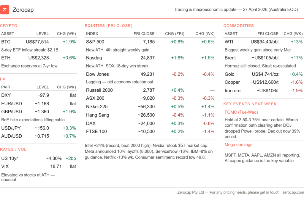 The real event risk is in the statement language and Powell’s final press conference before Warsh takes over. Q1 earnings season has been strong. Aggregate S&P 500 earnings growth is now tracking 16.1%, up from 14.4% at the start of April but the week ahead is the real test where MAG7 names report: Microsoft, Meta, Apple, and Amazon. The companies are worth nearly $16 trillion combined, representing a quarter of the S&P 500 Index’s market capitalization. AI capex guidance will determine whether the semiconductor rally has fundamental backing or has gotten ahead of itself.
