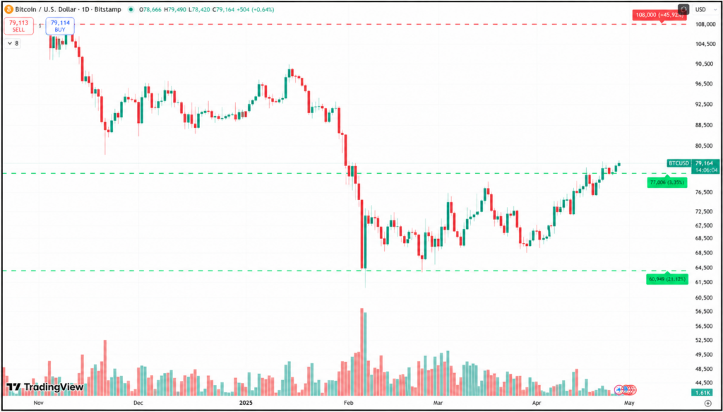 BTC consolidated near $77,500 after the prior week’s breakout, holding above the $76k level that was resistance for seven weeks and is now acting as support.