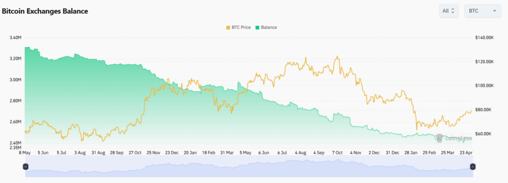 The structural story continues to strengthen underneath: US spot Bitcoin ETFs logged their eighth consecutive day of net inflows through April 23, totalling $2.1 billion over the streak, with cumulative inflows since launch reaching $58 billion and total assets crossing $102 billion.