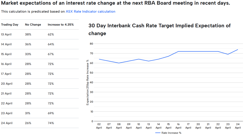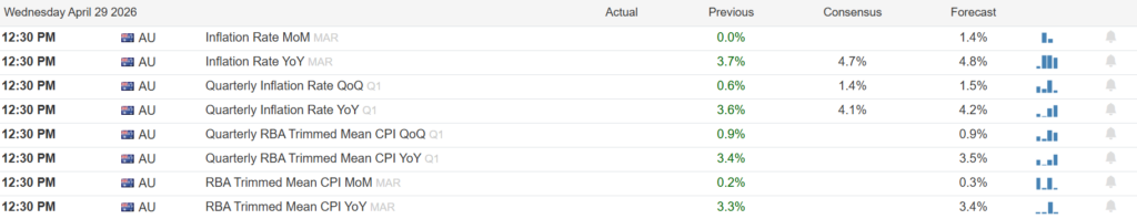 With inflation expectations notably elevated, there is the potential for a meaningful repricing in AUD volatility, particularly with the next RBA interest rate decision around the corner on May 5. Any material surprises in the print is likely to swing rate expectations – currently pricing a 74% chance that there will be a 25 basis point hike to 4.35% – and act as the key driver of near term AUD direction.