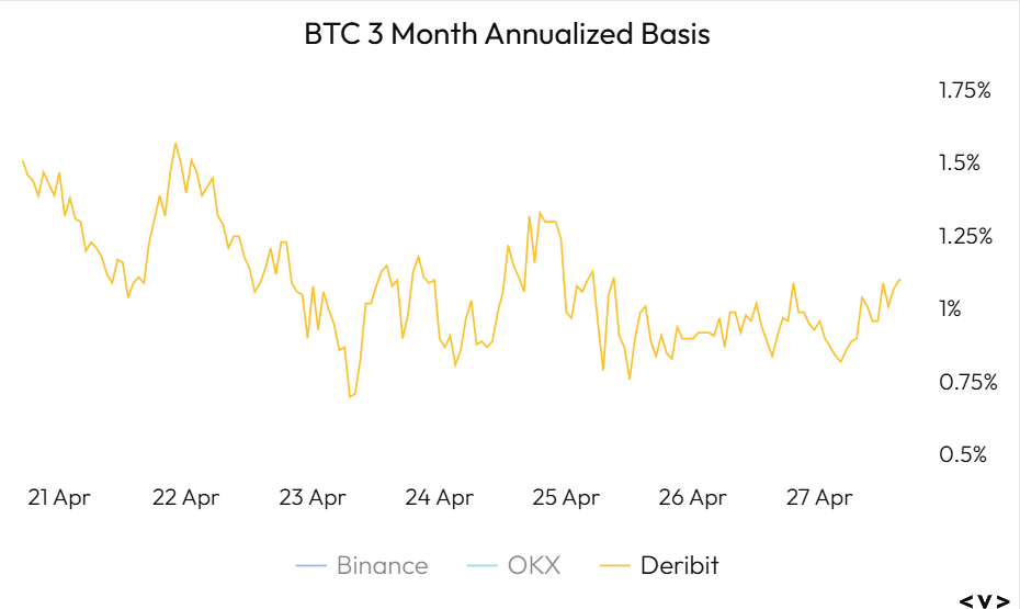 The 3-month annualised basis remains compressed near 1%, offering essentially no carry incentive relative to the risk-free rate. At these levels, cash-and-carry institutional participants have little reason to add basis exposure, and the futures curve is signalling that the market sees limited asymmetry over the next quarter. This reinforces the de-leveraged nature of the current environment, there is very little speculative length to shake out, which paradoxically makes the setup more constructive for a move higher on a catalyst.