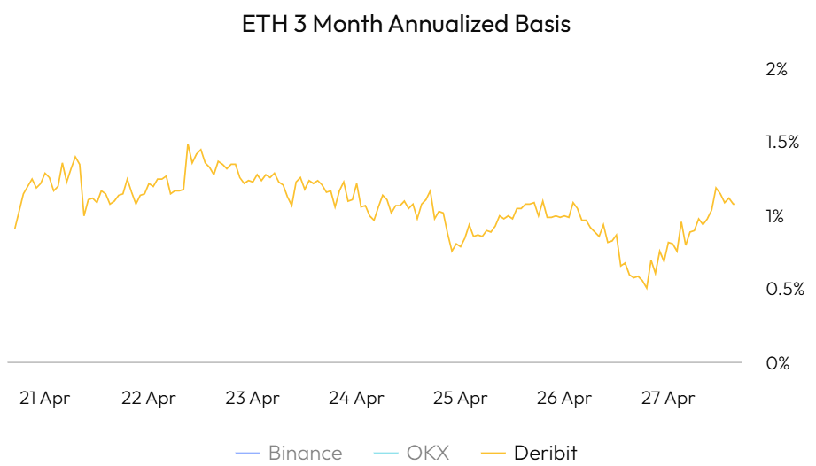 Funding rates flipped back to negative across most major exchanges after briefly turning positive during the mid-April ceasefire rally. The negative print is significant, it means shorts are once again the dominant side of perpetual contracts, paying longs to hold their positions. This is the same setup that preceded both the March 27 short squeeze and the April 18 Hormuz rally, where $762m in liquidations (95% shorts) were triggered. The implication is clear: there is a meaningful pool of short positioning that could be violently unwound if a catalyst arrives (FOMC, ceasefire deal, mega-cap earnings beat). ETH funding remains structurally weaker than BTC, rates below -0.01%, consistent with the persistent ETH and broader altcoin complex underperformance on the speculative demand side.