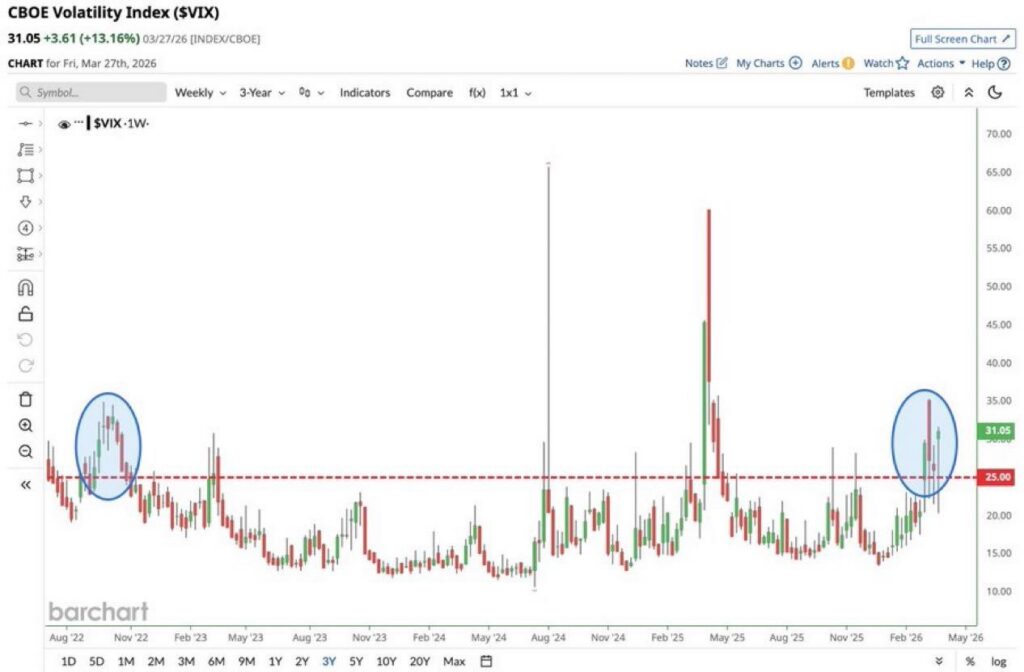 Last week’s volatility and uncertainty readings reflected the prevailing macro tone. The VIX closed at 31.05, its highest level since the war began, while CNN’s Fear & Greed Index dropped to “extreme fear,” marking its lowest reading since November.