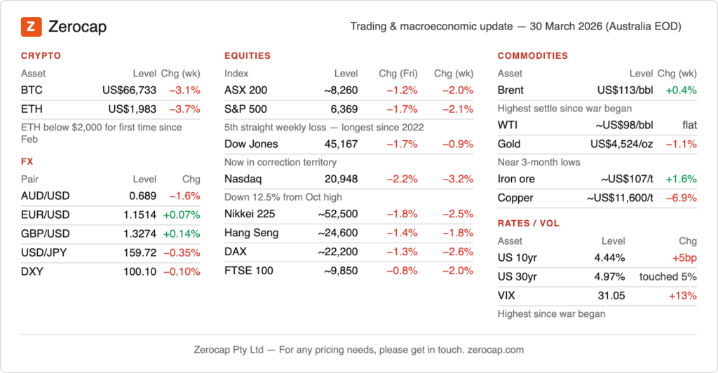 For crypto, the asset class followed broader risk-off moves amid last week’s macro tone. Bitcoin fell around 3.1% on the week to ~$66,733, with a sharp 3.6% drop on Friday alone. As Ethereum slipped below $2,000 for the first time since February, heavy trading also hit the altcoin complex.