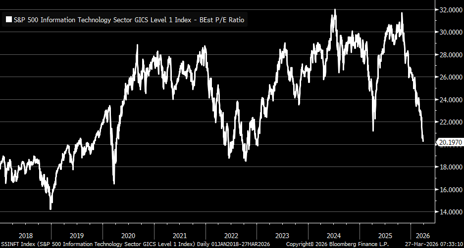 The S&P 500 closed Friday at 6,369 – a seven-month low – down 1.67% on the day and 2.1% for the week. The Dow shed 793 points on Friday to close at 45,167, while the Nasdaq dropped 2.15% to 20,948. All three major US benchmarks now sit below their 200-day moving averages. Tech valuations have also compressed sharply, with the sector’s forward P/E falling to 20.2x from 31.7x in just five months.