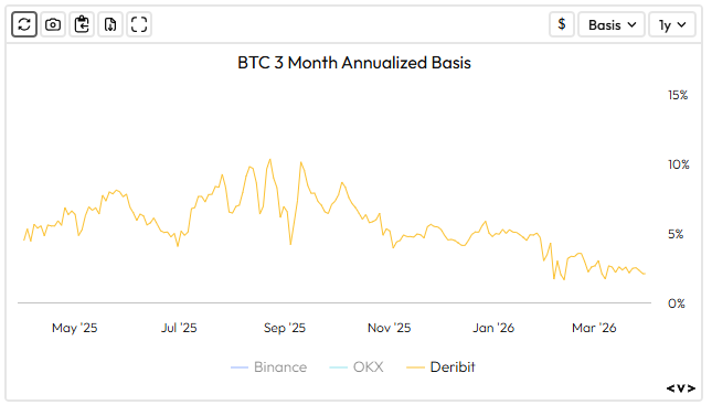 The March 27 quarterly options expiry, with roughly $14 billion in BTC notional, passed without a dramatic move but left positioning fragile. Bitcoin has now lost the $70,000 level that had been acting as a loose floor, and funding rates across major exchanges have turned negative, reflecting growing short positioning.
