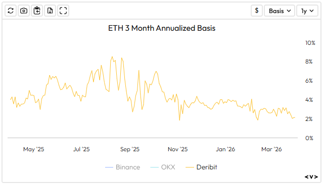 BTC annualised forward basis continues to trade below Ethereum (BTC 3.26% relative to ETH 3.42% annualised, as profiled off the 25 December 2026 Deribit future), representing a weekly increase of 111bps and 98bps respectively.