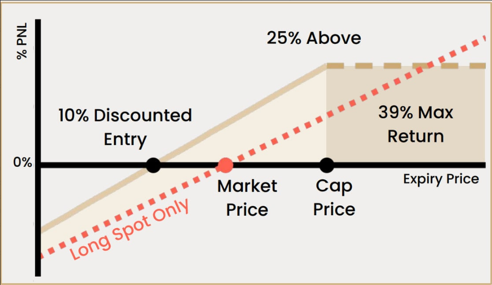 - At maturity, the investor either receives a fixed USD coupon if BTC is above the cap level, or acquires BTC at a predefined discount to today’s spot price if the asset settles below the cap.