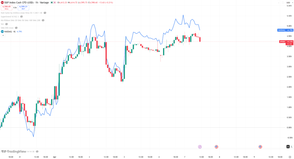 Equities rallied sharply in a shortened trading week (markets closed Good Friday). The S&P 500 gained 3.4% to close at 6,612, snapping its five-week losing streak. The Nasdaq outperformed with a 4.4% gain to 21,996, its best week since November 2025, while the Dow added 3.0% to 46,670. The recovery was broad-based but volatile, with Thursday’s session seeing a 600-point intraday Dow swing before major indices recovered from steep losses to close mixed. Despite the bounce, the S&P 500 remains roughly 6% below its January highs and all three major benchmarks still sit below their 200-day moving averages. Tech led the charge on the upside with Alphabet and Amazon each up over 1% on Monday, and Micron surging 3.2%. The VIX pulled back to 24.2 from its war-high above 31, but remains well above pre-conflict levels.