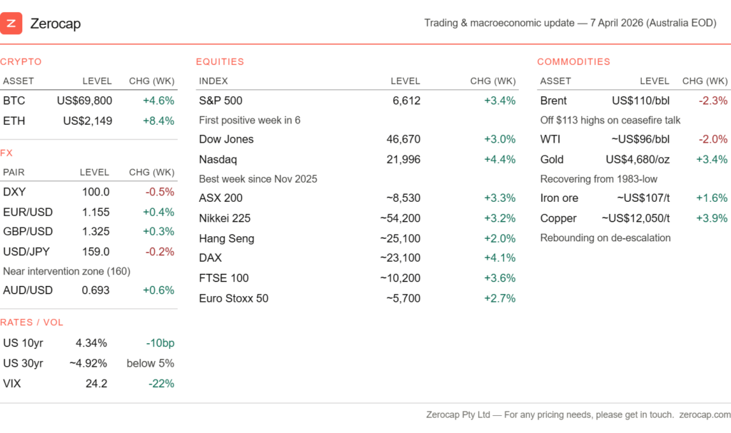 Risk assets posted their first positive week in six as ceasefire diplomacy injected a dose of cautious optimism into markets battered by five consecutive weeks of selling. The narrative arc of the week was pure whiplash. Monday saw a sharp rally after reports that the US, Iran and regional mediators were discussing terms for a potential 45-day ceasefire and the reopening of the Strait of Hormuz. Dow futures surged 1,100 points overnight and Brent briefly dipped below $100 for the first time since early March. That optimism was abruptly reversed on Wednesday night when Trump delivered a primetime address vowing to continue strikes on Iran for “two to three more weeks,” threatening to hit power plants and bridges and send the country “back to the stone age.” Oil surged above $113 and equities tanked intraday. The Dow was down over 600 points before partially recovering after Iranian state media reported that Tehran was working with Oman on a protocol to allow some ships through the Strait.