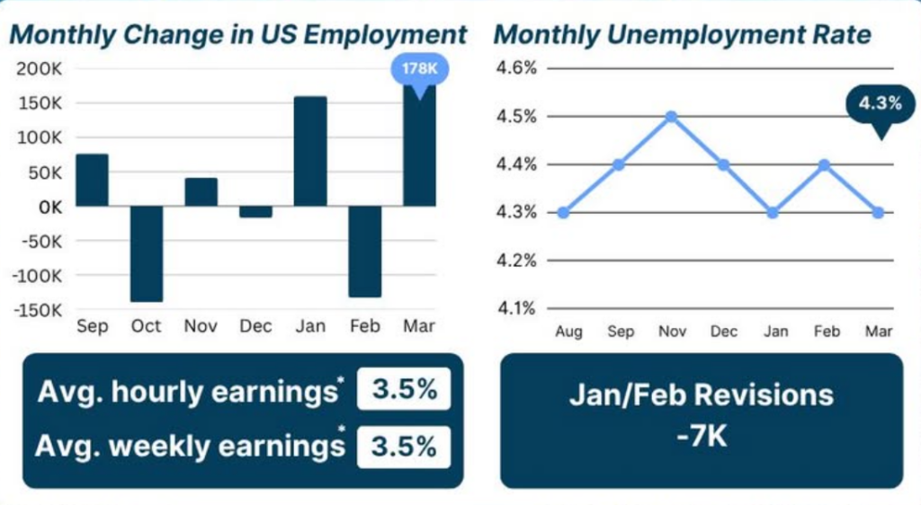 The week closed with Trump extending his strike pause deadline to April 8 (tomorrow) and floating the possibility of talks, leaving markets hanging on every headline. On the data front, March nonfarm payrolls printed a healthy +178,000 (released Good Friday with markets closed), with unemployment at 4.3%. The ISM Services PMI showed growth slowing to 54 from 56.1, but the prices paid component surged, reinforcing the theme that the war-driven energy shock is feeding through into broader inflation.