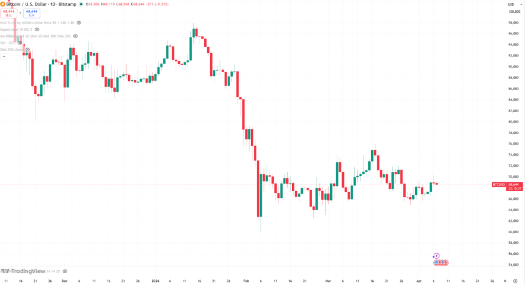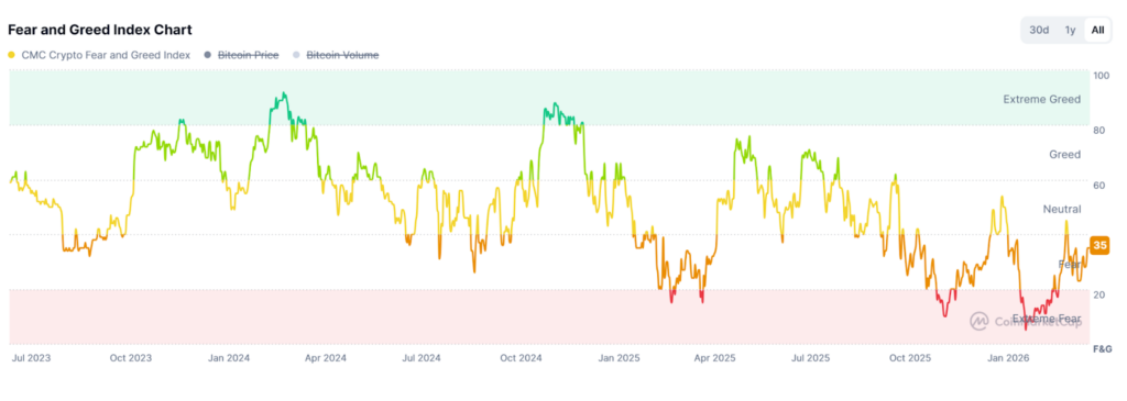 Currently, BTC remains range-bound between $66k and $73k, with $71,500 as stubborn resistance. The Crypto Fear & Greed Index sits at 29 (“Fear”), the lowest sustained period since the 2022 bear market.