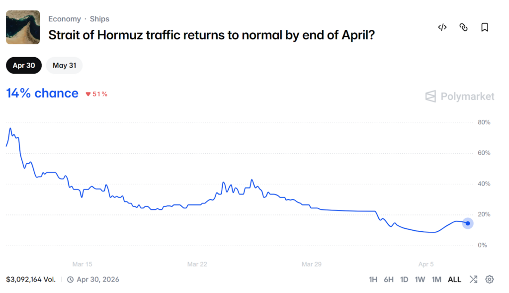 With Polymarket pricing just 14% odds of Strait of Hormuz traffic normalising by month-end, the ceasefire catalyst that could break the range higher remains binary.