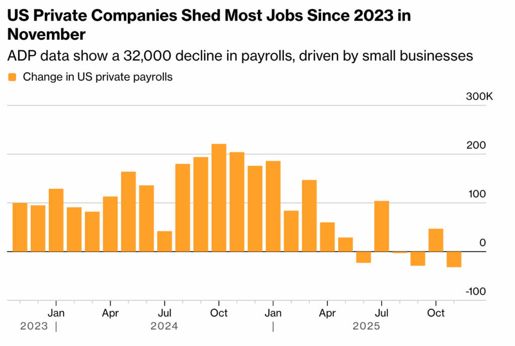 In economic news, the ADP employment report showed a 32,000 decline in private payrolls during November – reversing October’s (revised) +47,000, marking the largest monthly drop since March 2023.