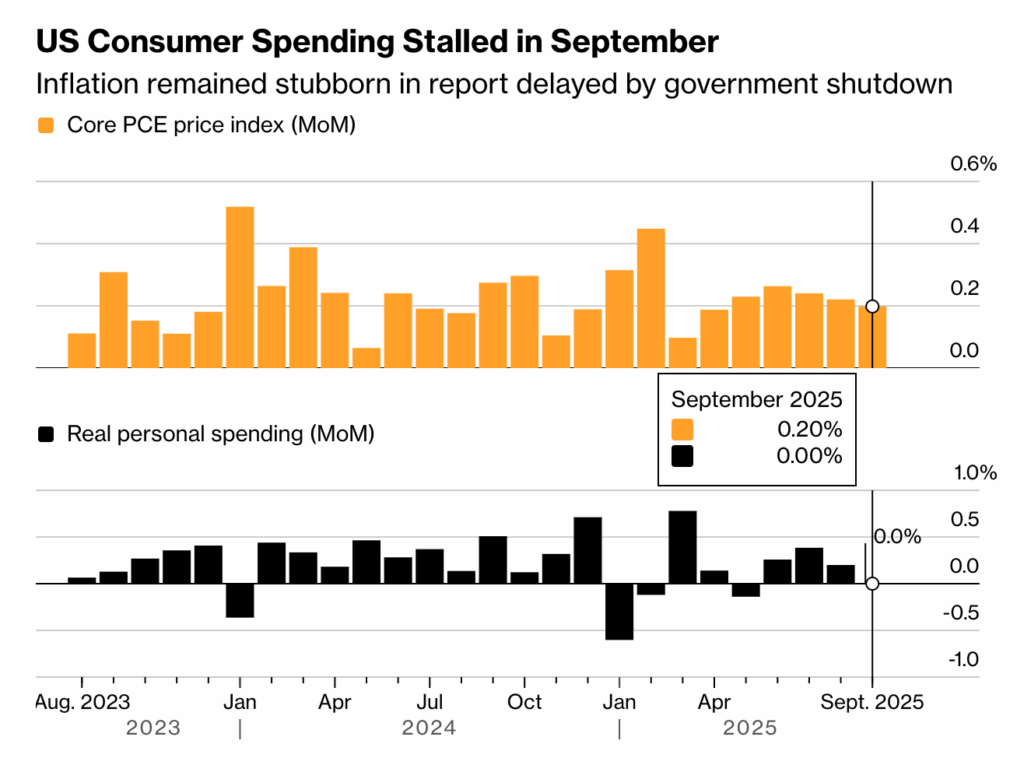 Last week’s US inflation data saw September PCE inflation rise 0.3% MoM (headline), while core PCE increased 0.2% MoM. Headline PCE inflation has remained ‘sticky’ and unchanged from the August reading, up 2.8% YoY. It must be noted that PCE inflation remains the FOMC’s preferred measure for inflation. We continue to wait for the October release which remains delayed due to the U.S. government shutdown.