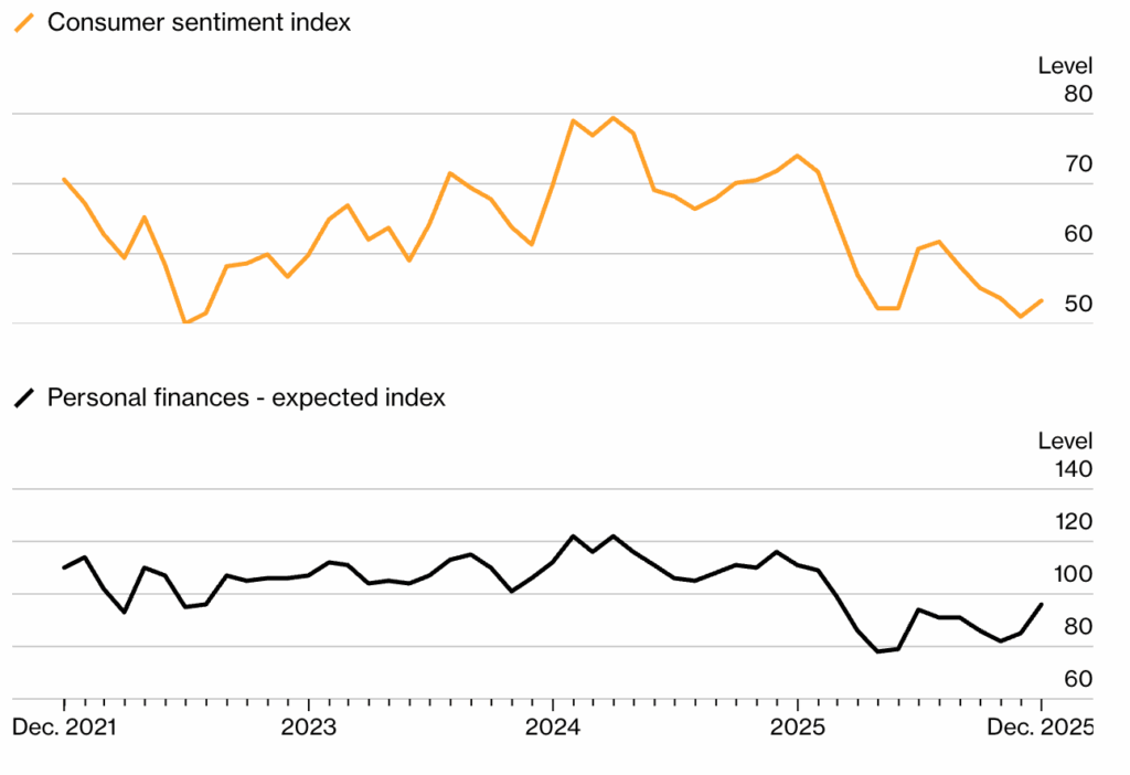 On the consumer front, the preliminary University of Michigan consumer sentiment index (prelim) ticked up to 53.3 for December (Nov: 51.0), helped by improved personal finance expectations. One-year inflation expectations eased within the survey to 4.1% – a four month downtrend and the lowest since January 2025.