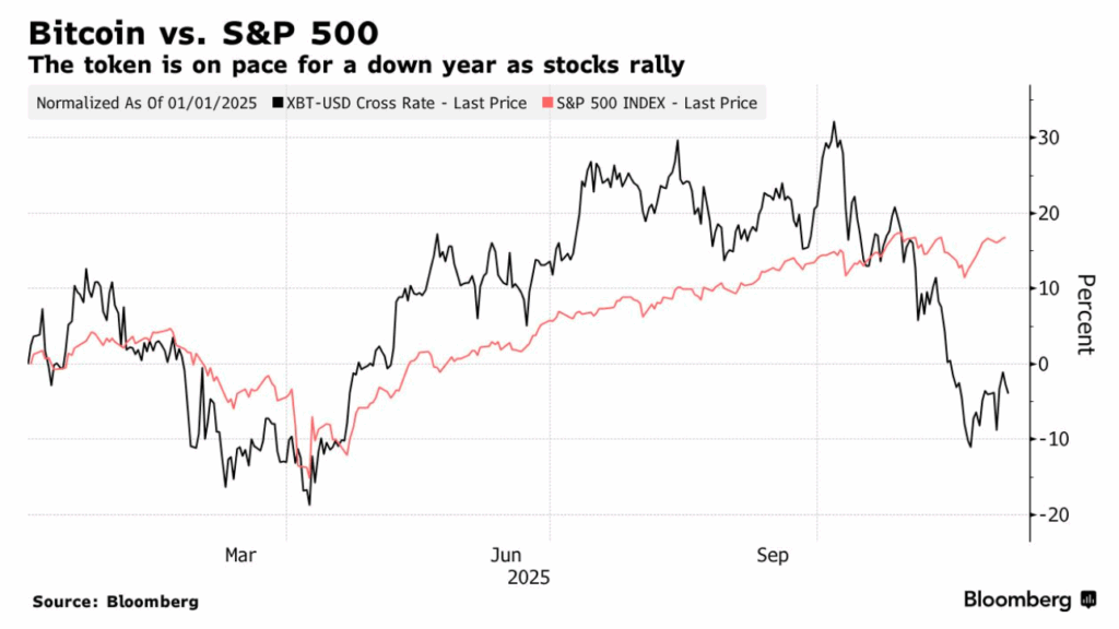 For the first time in more than a decade, Bitcoin is on track to underperform the S&P 500 on a calendar-year basis. The decoupling from broader risk assets is notable given prior “crypto winters”, where drawdowns typically coincided with wider risk-off episodes.