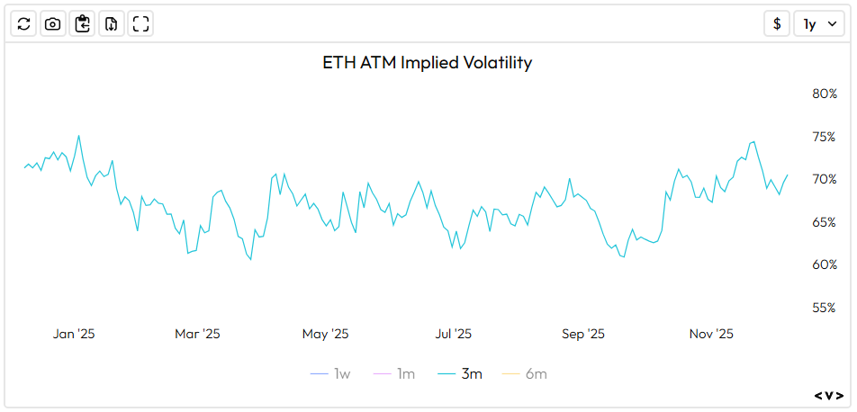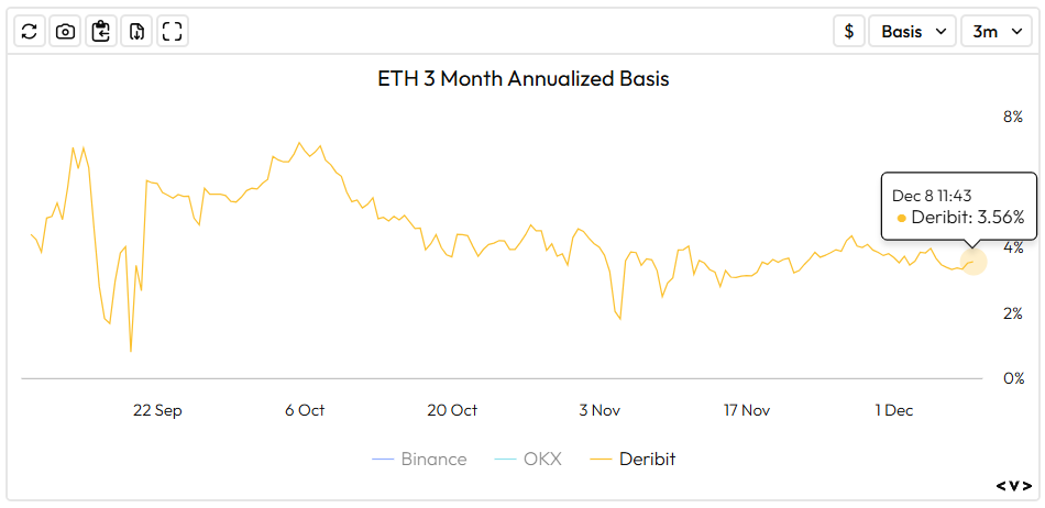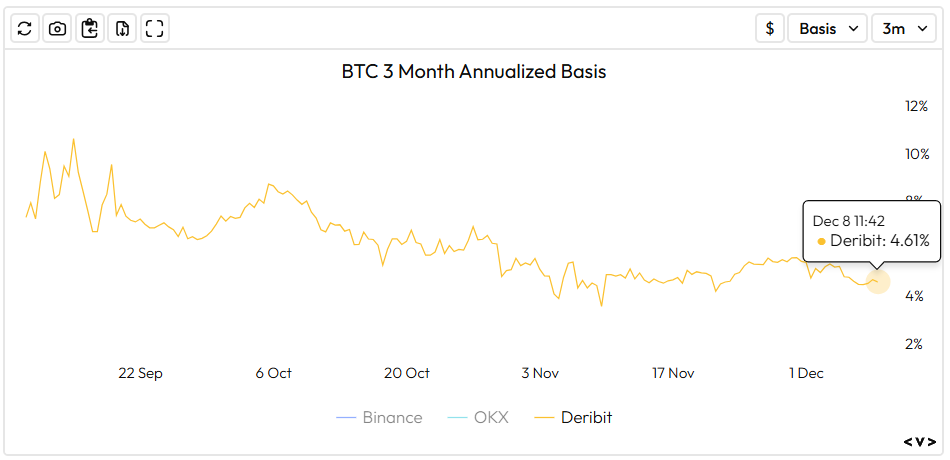 Basis rates were flat this week – and have been for some time – suggesting they may have bottomed until the Fed cuts rates further. The 90-day annualized BTC basis sits near its yearly low at 4.61%, with ETH similarly subdued at 3.56%.